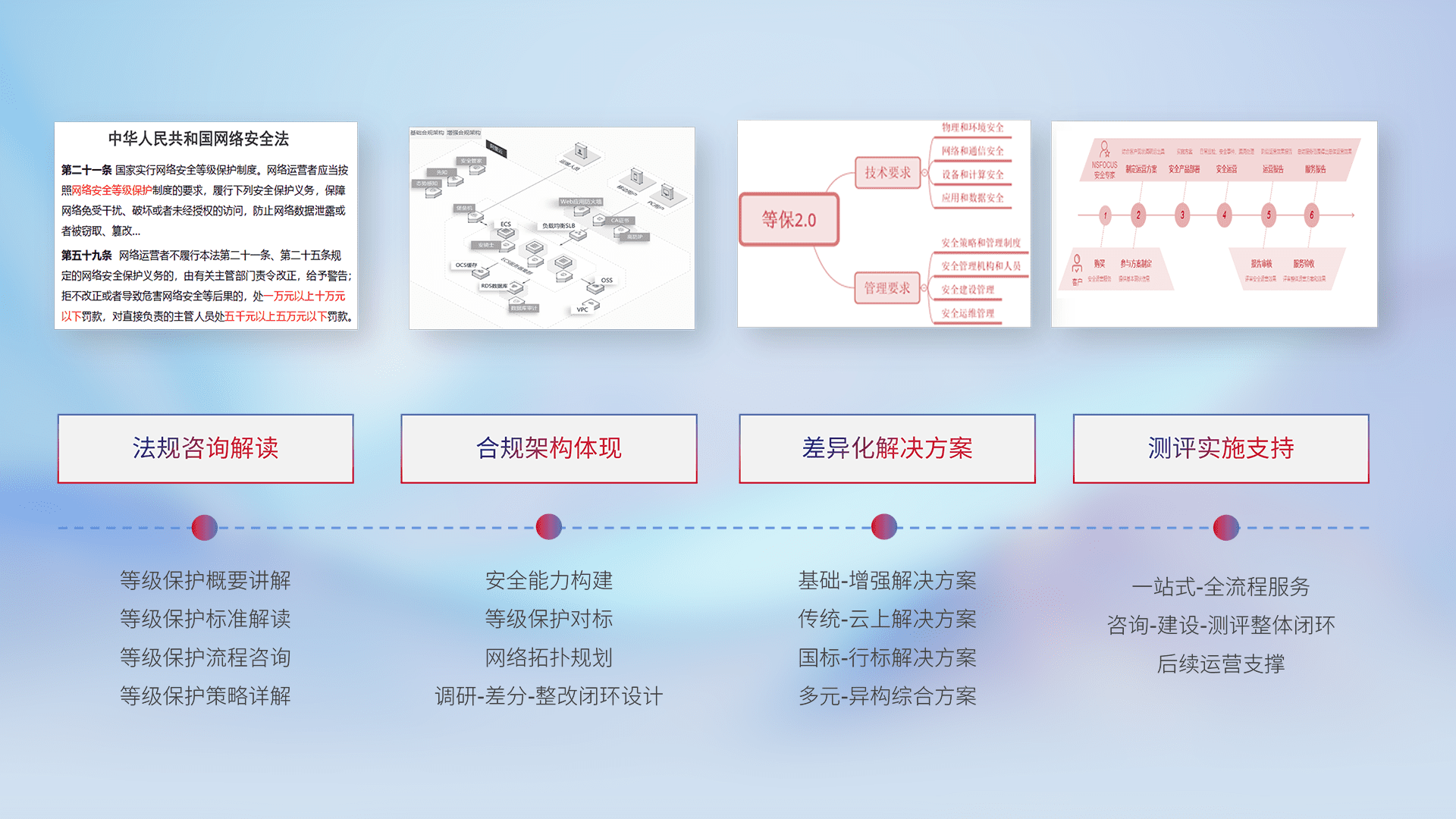 通过专业的法律咨询解读、、、、合规架构体现、、、差异化解决方案、、、、测试实施支持等服务,,为客户量身打造等保合规体系。。。